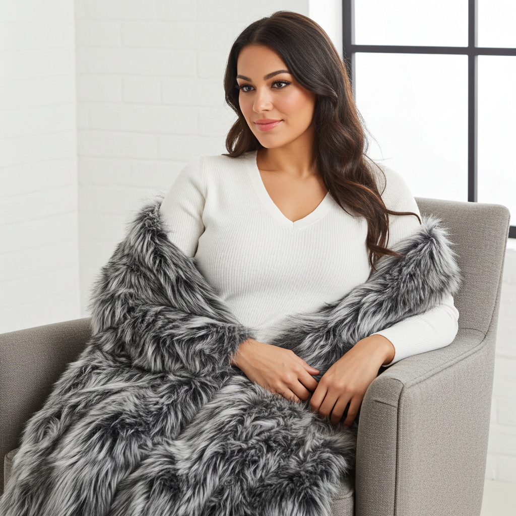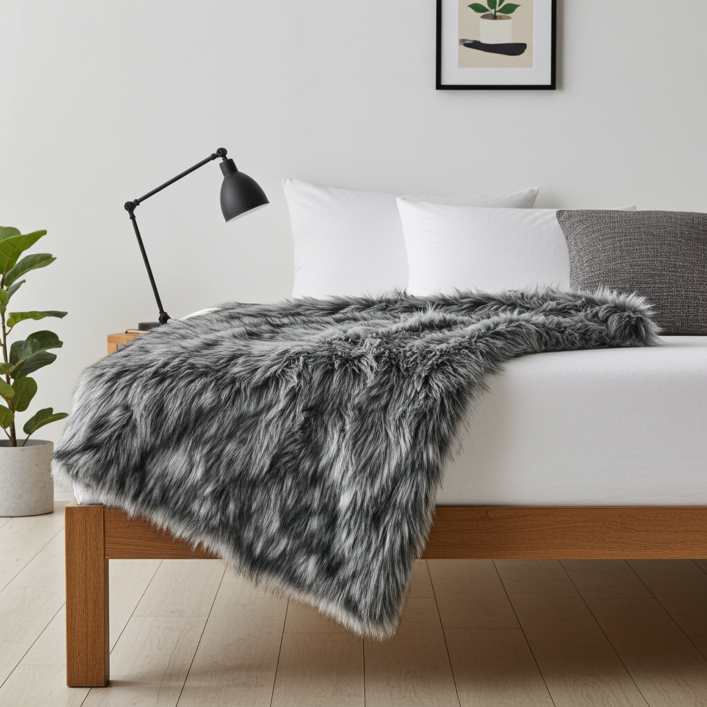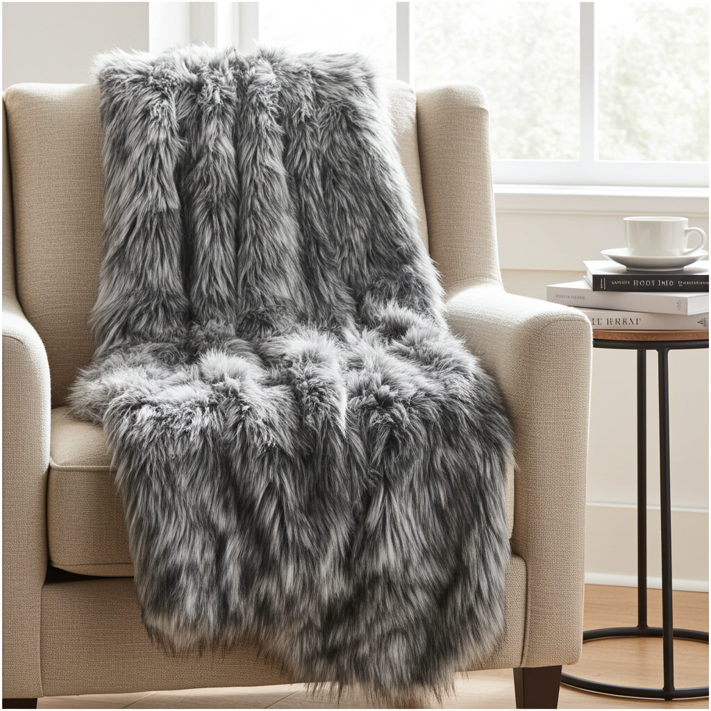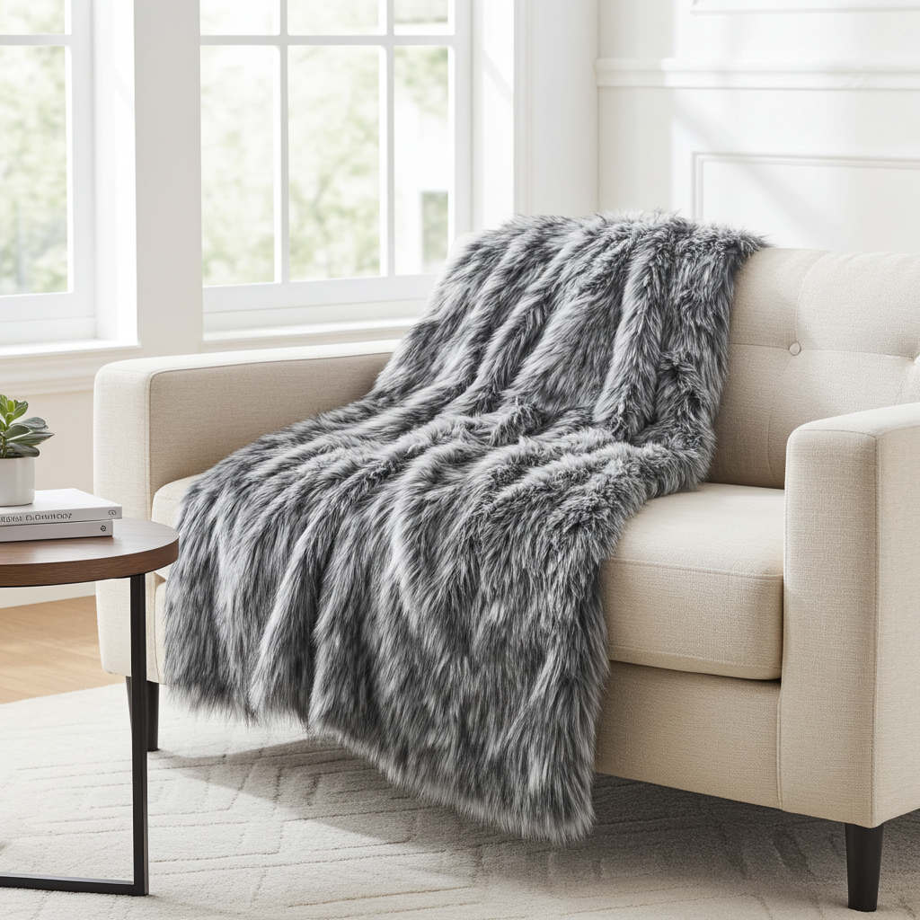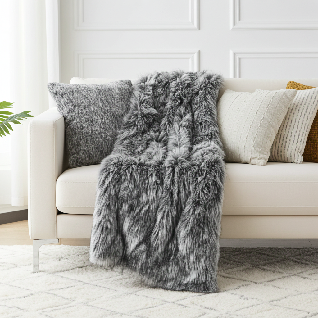 Luxury gray wolf faux fur throw blanket adds texture and warmth to any room. This medium/long pile faux fur is gray with a super soft gray microfiber backing.