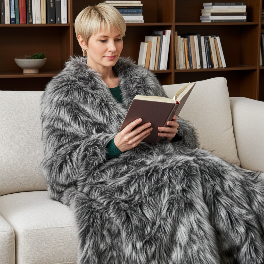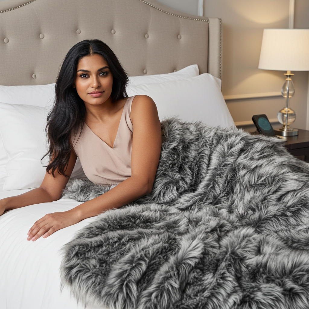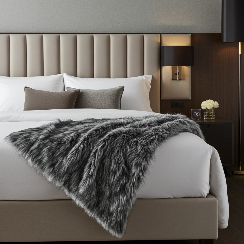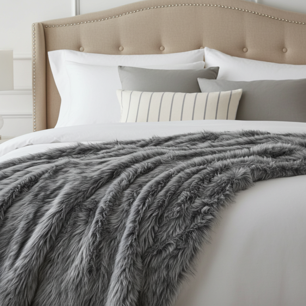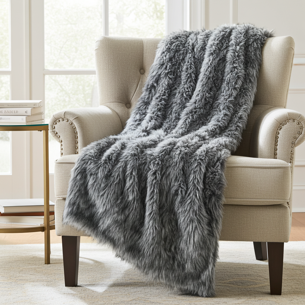 Luxury gray wolf faux fur throw blanket adds texture and warmth to any room. This medium/long pile faux fur is gray with a super soft gray microfiber backing.