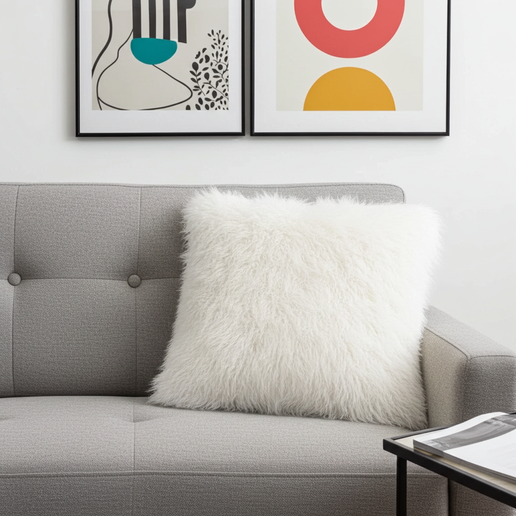 "Luxury, trendy and definitely a conversation starter. Made from the finest materials to dazzle your eyes and feed your senses. Give your guests and vistors something to think about! Insert included. plutus off white mongolian fur off white animal faux fur luxury throw pillow. The fabric of this luxury pillow is a blend of Acrylic.